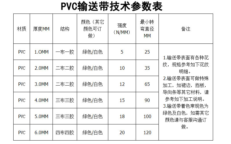 五、根據(jù)PVC輸送帶產(chǎn)品織物層次可分為:一布一膠、二布一膠、一布二膠、二布二膠、二布三膠、三布三膠、三布四膠、四布四膠、四布五膠、五布五膠等。