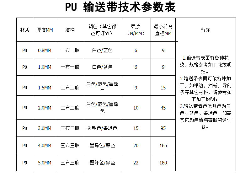 2.PU輸送帶表面可加裙邊擋板; 輸送帶背面可加導(dǎo)條、紅膠、海綿等特殊加工。