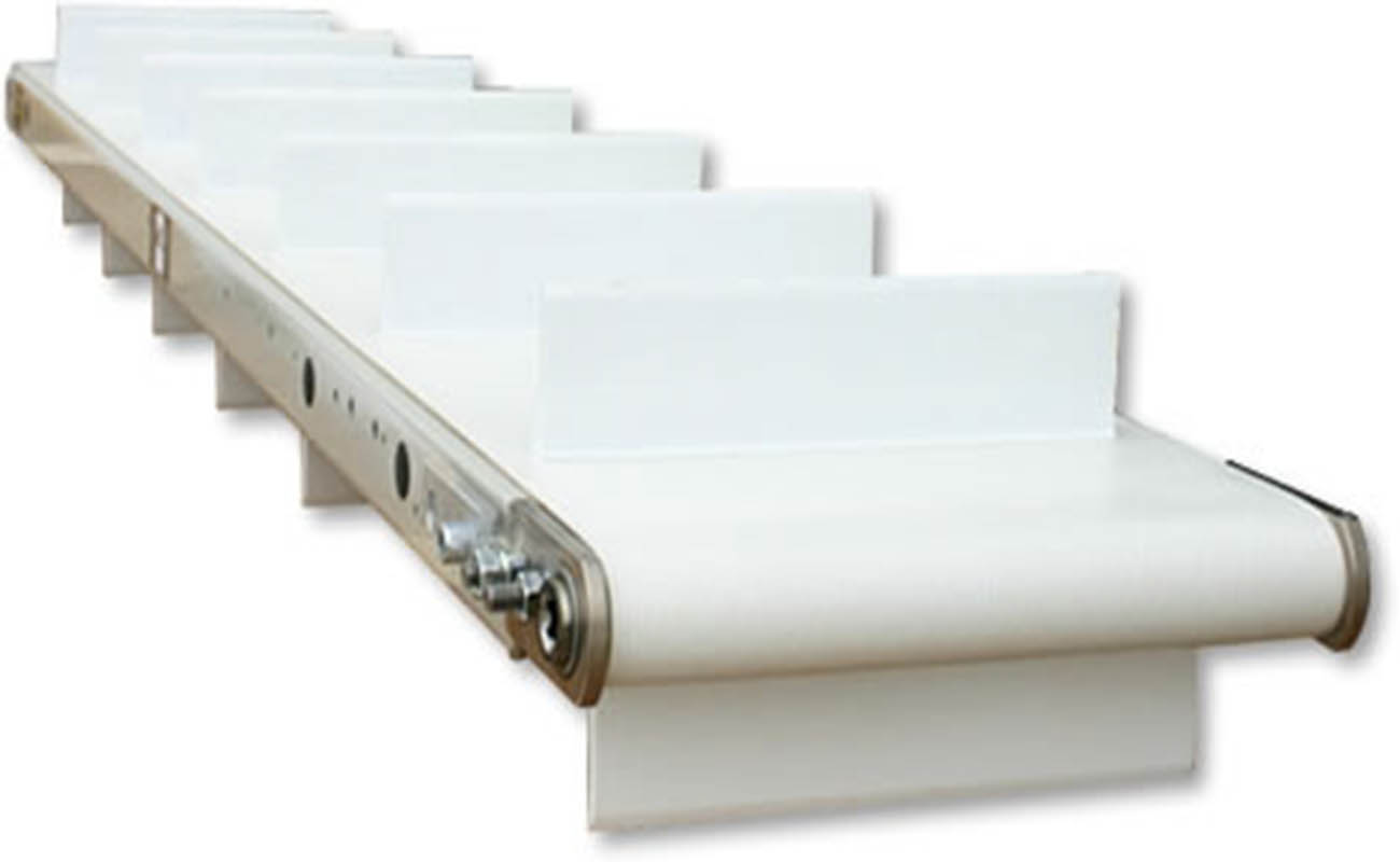 PU白色食品輸送帶(裙邊擋板帶),擋邊起防止物料測滑撒落的作用。為便于轉(zhuǎn)彎,裙邊設(shè)計成波紋狀;橫隔板的作用是承托物料,為了實現(xiàn)大傾角輸送,采用T型TC型。檔邊和橫隔板是用二次硫化的方法與基帶連接的,具有很高的連接強度。用于輸送易散落的粉狀、粒狀、小塊狀、糊狀及液態(tài)狀物料。